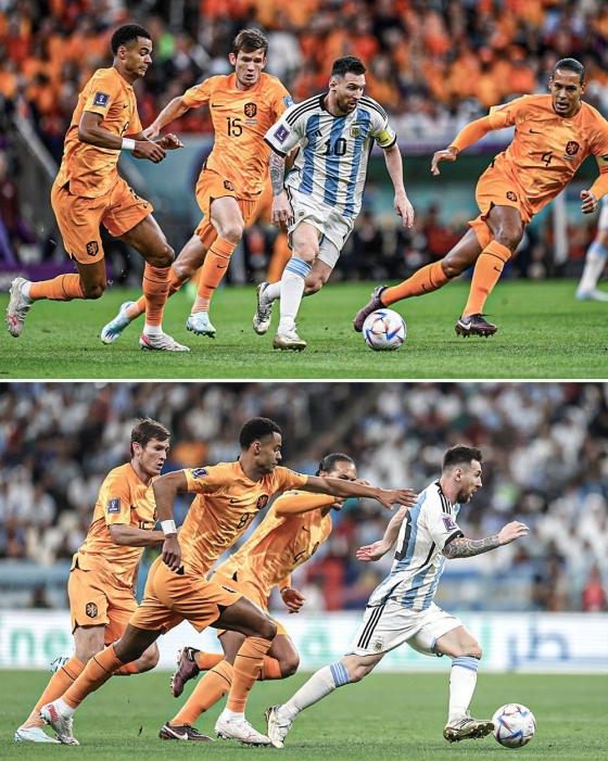 사진 속 메시는 폭풍 드리블을 하고 있었다. 네덜란드 수비수 3명이 달라 붙었지만 소용 없었다. 그 중 세계 최고 수비수라 불리는 버질 판 다이크도 있었다. 천하의 판 다이크도 메시 앞에서 작아졌다.