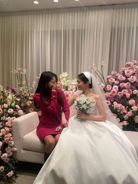 공개된 사진에는 지연이 있는 신부대기실을 찾은 오윤아의 모습이 담겼다. 오윤아는 아리따운 신부의 자태에 반한 듯 입을 가리고 있고 있다.