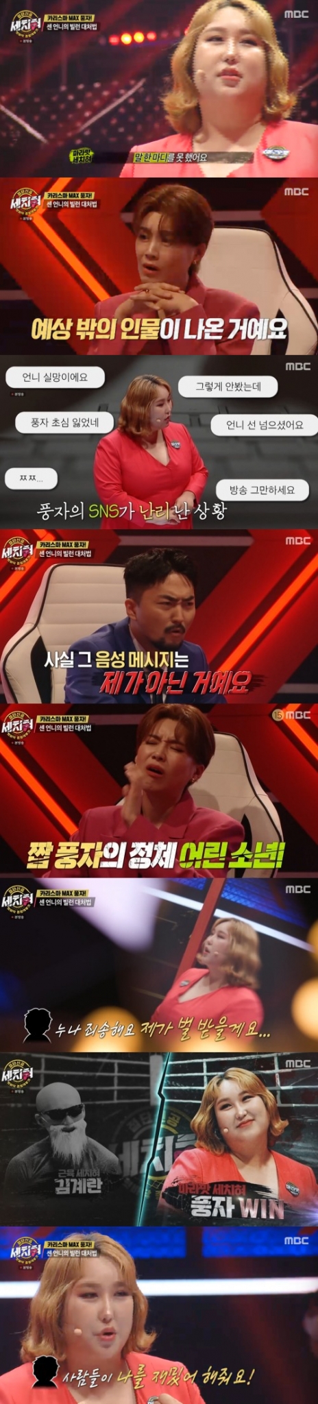 풍자는 "근데 더한 태클러가 등장했다. DM이 폭발했다. 그러던 중에 음성 메시지가 왔다. 이틀을 못 눌렀다. 겁이 났다. 음성 메시지를 눌러봤다. 제 목소리가 나온다. 말도 안 되는 언행을 하고 있더라. 비하 발언을 하고 쌍욕을 하는 음성 메시지가 있다. '내가 언제 했지?'라고 생각하며 1시간을 식은땀을 흘렸다"라면서 그 음성메시지는 자신이 아니었다고 이야기했다.