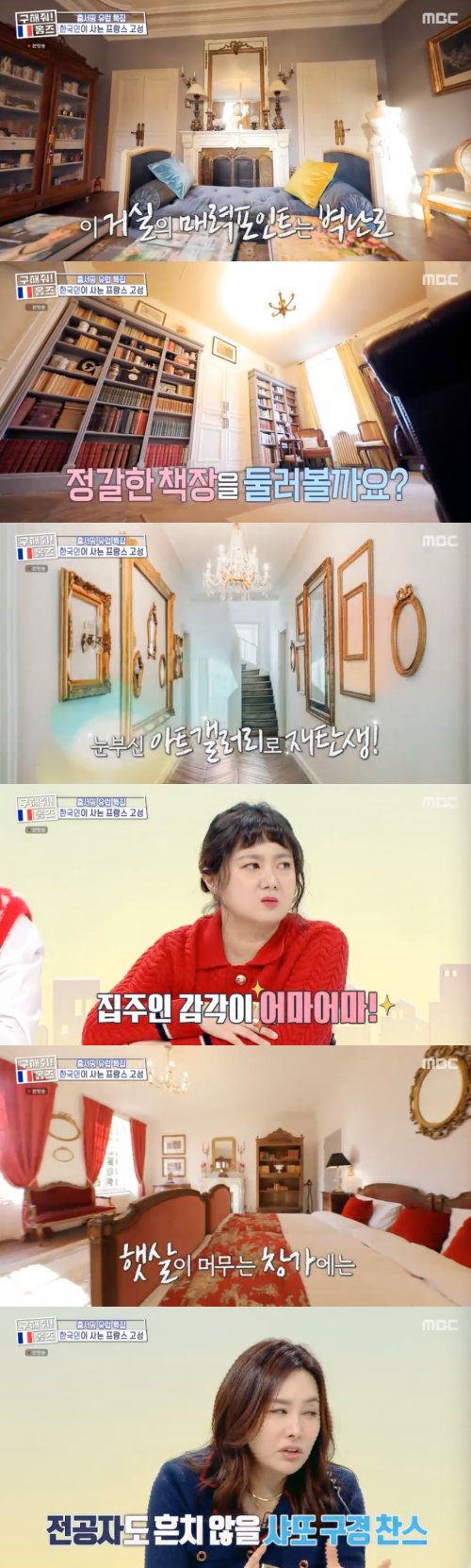 이어 "그리고 '샤또'는 부자와 귀족들이 사는 대저택을 지칭한다"라고 설명했다. 집 외부의 정원부터 조각상과 그네, 연못은 동화 속에 나올 듯한 비주얼로 눈길을 끌었다. 이어 계단을 따라 1층으로 올라가면 100년 넘은 원조 쉐브론 바닥재와 우아한 크리스털 샹들리에가 눈길을 사로잡았다.