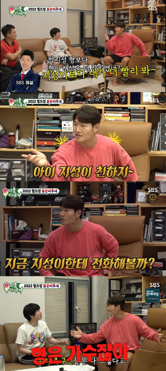 김종국이 박지성을 언급하자 김희철은 "지성이라고 하냐"라 물었고, 김종국은 "지성이랑 친하다"라고 답했다. 이에 김준호는 "정환이랑 나랑 친구다"라며 전 축구선수 안정환을 언급하며 스포츠계 인맥을 자랑했다. 김준호의 안정환 언급에 김종국은 "얼마나 친하냐. 톡하면 바로 오냐. 나는 지성이한테 전화하면 바로 온다"라며 박지성과의 친분을 과시했다.