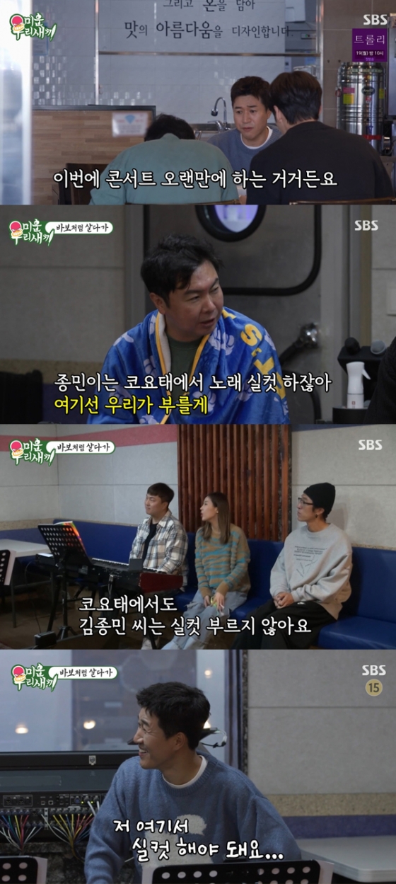 이날김종민은 "코요태 단독 콘서트를 3년 만에 한다. 바보 형제들이 깜짝 게스트로 해주면 어떨까 한다"라며 식사 대접의 목적을 밝혔다. 이어 " 어제도 26곡 노래를 연습하느라 목이 많이 쉬었다"며 한창 콘서트 연습 중인 근황을 전했다. 그러나 이를 들은 임원희는 "그런데 너가 노래를 많이 하나?"라고 팩폭을 날려 모두를 폭소케했다.