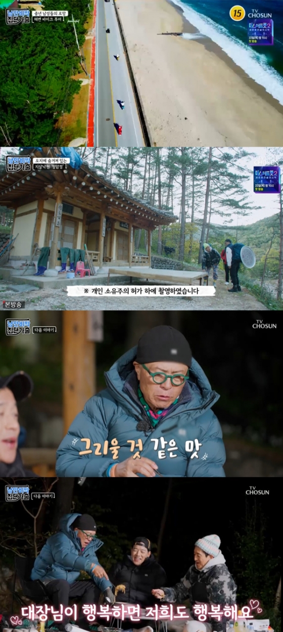11일 방송된 TV CHOSUN 예능프로그램 '낭만비박 집단가출'에서는 울진으로 떠난 신현준, 류시원 그리고 허영만이 두 번째 날의 첫 번째 일정으로 류시원이 기획해 온 해변 바이크를 타며 라이딩하는 모습이 그려졌다.