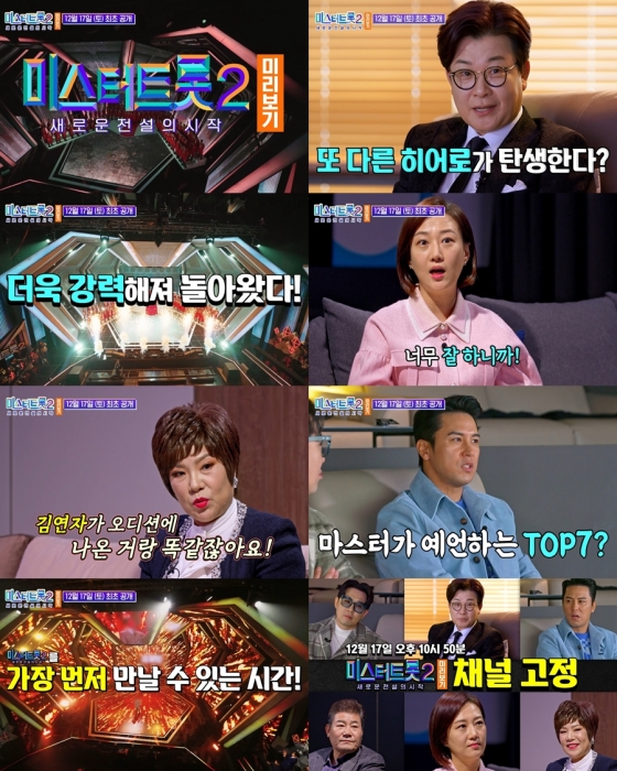 한편, 오는 12월 22일(목) 밤 10시 첫 방송되는 '미스터트롯2-새로운 전설의 시작'은 참가자들의 면면이 베일을 벗은 직후부터 연일 온오프라인을 뜨겁게 달구며 남다른 화제성으로 그 명성을 입증했다. 특히, 헤비급 타이틀전을 방불케하는 역대 최강 우승부, 송가인도 이긴 괴물 '트롯 영재' 유소년부 박성온, '트로트에 진심'인 연예인 참가자들의 '영역 파괴' 선언 등 놀라운 인물들의 출연 소식이 속속 전해지며 이슈의 중심이 되고 있다.