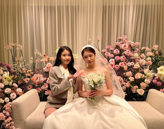 공개된 사진에는 지연의 신부대기실을 방문한 아이유의 모습이 담겼다. 연예계 절친으로 알려져 있는 두 사람은 나란히 앉아 미소를 짓고 있다.