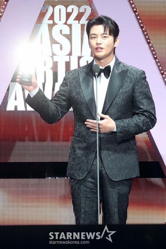 배우 서인국이 13일 오후 일본 나고야 니혼가이시홀에서 열린 스타뉴스-미디어보이 주최 '2022 Asia Artist Awards IN JAPAN'(2022 아시아 아티스트 어워즈, 이하 2022 AAA)에서 AAA 베스트아티스트상을 수상하고 소감을 말하고 있다.