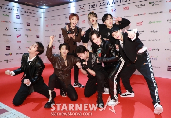 그룹 스트레이키즈가 13일 오후 일본 나고야 니혼가이시홀에서 열린 스타뉴스-미디어보이 주최 '2022 Asia Artist Awards IN JAPAN'(2022 아시아 아티스트 어워즈, 이하 2022 AAA)에서 대상인 AAA 올해의 앨범상을 수상한 뒤 포즈를 취하고 있다.