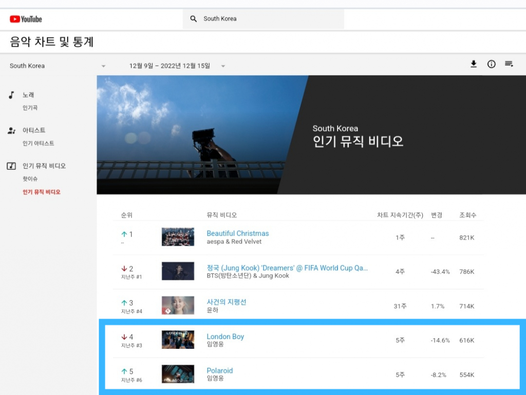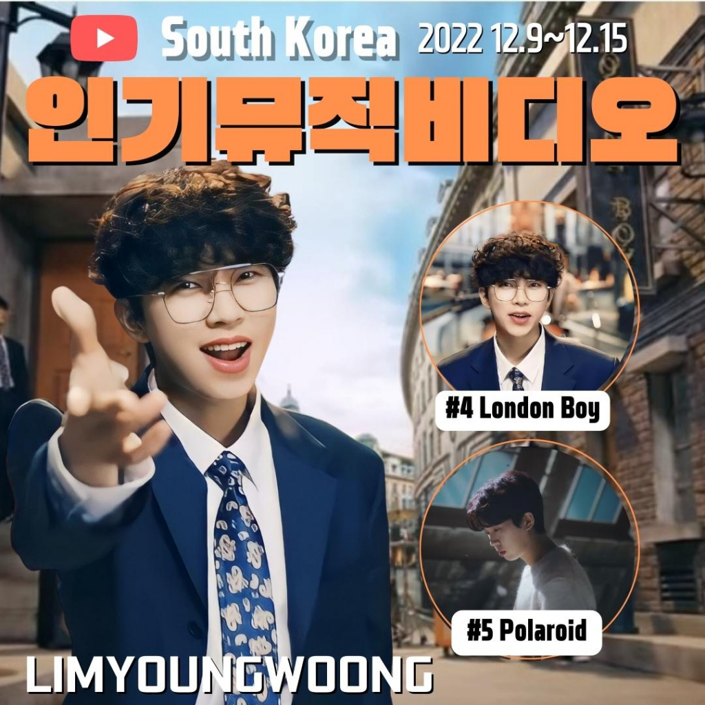 가수 임영웅의 '런던보이'(London Boy)와 '폴라로이드'(Polaroid) 뮤직비디오가 유튜브 인기 뮤직비디오 상위권을 휩쓸며 인기를 빛냈다.