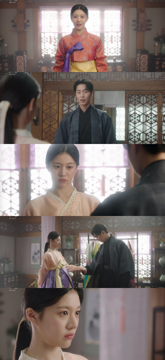 이날 김도주(오나라 분)는 오랜만에 열린 연회 소식에 신나 옷을 잔뜩 준비했다. 김도주는 진부연에 "30벌은 입어보고 고르셔야 한다"며 쉴새 없이 옷을 갈아입혔고, 진부연은 어떤 옷을 입든 완벽한 미모를 자랑해 탄성을 자아냈다. 이때 등장한 장욱(이재욱 분)은 "미모에 대한 심각한 자신감에 비해 치장이 과한 거 아니냐"고 물어 웃음을 자아냈다.
