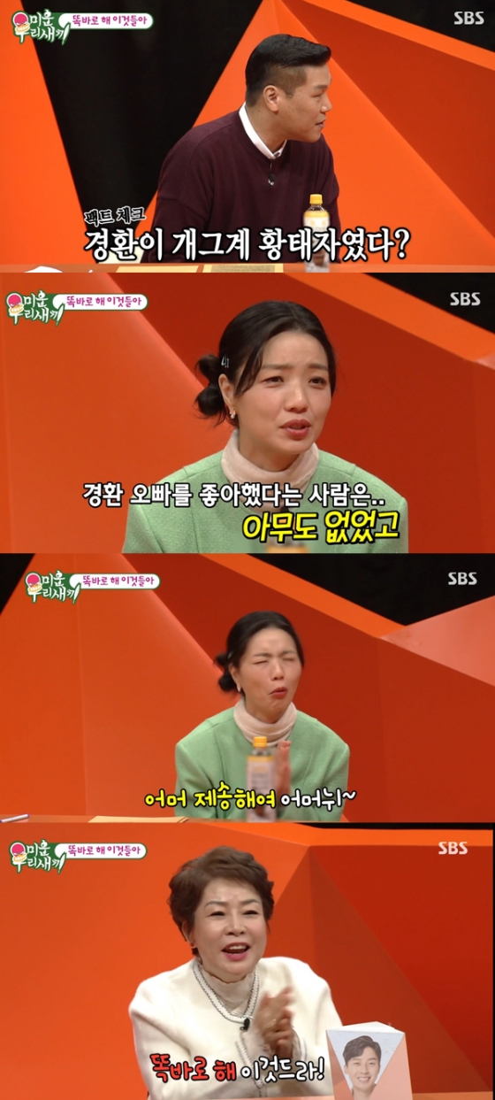 이어 서장훈은 "허경환과 친한 개그맨 선후배 사이다. 허경환이 여자 개그만들 사이에서 황태자라는 소문이 몇 퍼센트 사실이냐"고 안영미에게 물었다. 그리고 안영미는 "제가 들은 걸로는 경환 오빠를 좋아했다는 사람은 아무도 없었다"라고 답했다. 이를 들은 허경환 모친은"경환이는 본인이 그런 소문을 만들 성격이 아니다"라고 선을 그었고, 서장훈은 "이 발언을 한 거는 경환이 어머님하고 전쟁을 선포한거다"라 했다.