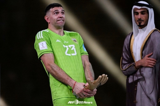 에밀리아노 마르티네스가 19일(한국시간) 2022 카타르 월드컵 우승 시상식에서 골든글러브를 수상한 뒤 기괴한 세리머니를 펼치고 있다. /AFPBBNews=뉴스1