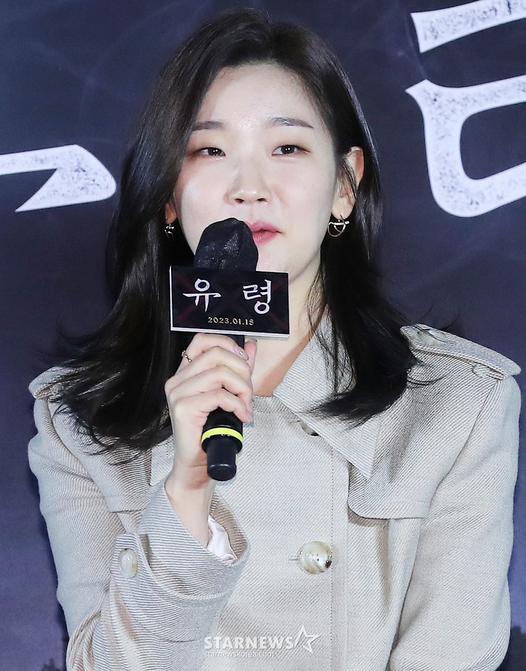 배우 박소담이 19일 오전 서울 용산구 아이파크몰 CGV에서 진행된 영화 '유령' 제작보고회에 참석해 인사말을 하고 있다.