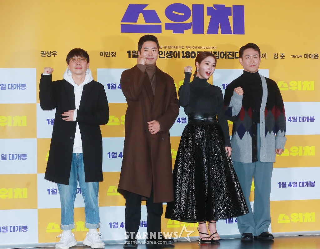 마대윤 감독, 배우 권상우, 이민정, 오정세가 19일 오후 서울 광진구 롯데시네마 건대입구점에서 진행된 영화 '스위치'(감독 마대윤) 언론시사회에 참석해 포즈를 취하고 있다.