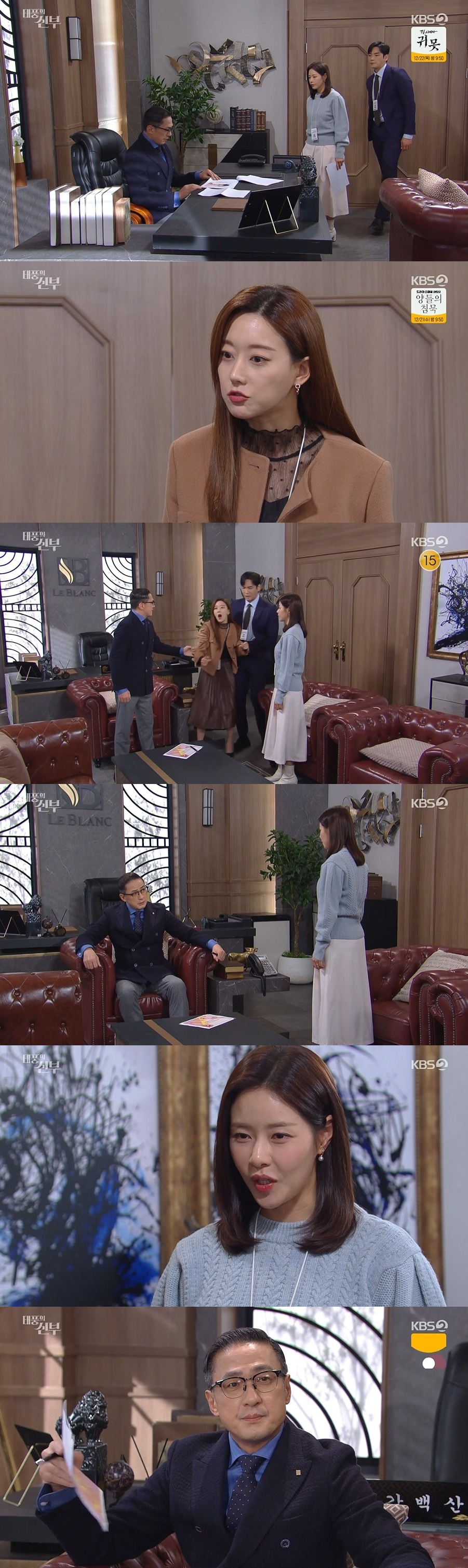 19일 오후 방송된 KBS 2TV 일일드라마 '태풍의 신부'에서는 은서연(박하나 분)과 강태풍(강지섭 분)이 르블랑 회장 강백산(손창민 분)을 찾은 모습이 담겼다.