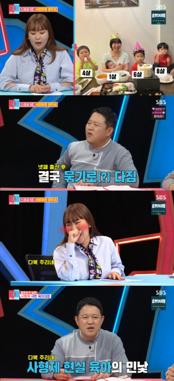 이날 이지혜는 정주리에 "결혼 8년 차인데 애가 넷이다. 임신과 출산을 계속 반복했다. 그런데 다섯째가 계획 중이라고"라고 물었다. 정주리는 "저희가 이제 2년마다 애가 생겼다. 남편이 조리원에 있을 때 수술을 하기로 했었는데 바빠서 못했다"라고 전했다.