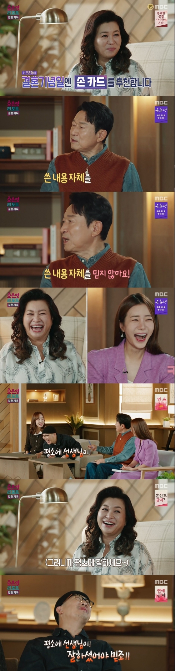 이날 하하는 "혹시 우리 멤버들은 마지막으로 손 편지 쓴 게 언제냐"라고 물었다. 이에 오은영은 "얼마 전 결혼기념일이라 손 편지는 아니고 손 카드를 썼다"라고 고백하며 웃었다.