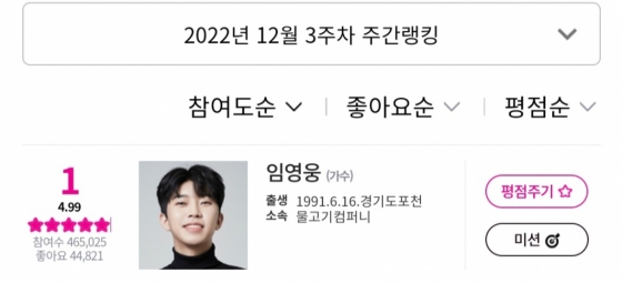 임영웅은 12월 16일부터 12월 22일까지 집계된 아이돌차트 평점랭킹에서 46만 5025표를 획득, 1위를 차지했다.
