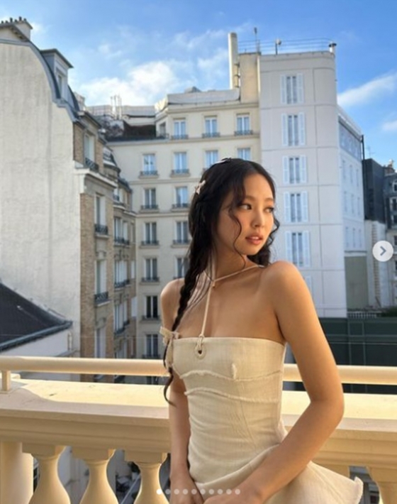 제니는 흰색의 슬리브리스 미니 원피스를 입고 곱슬거리는 머리카락을 뽐내며 포즈를 취하고 있다. 작은 얼굴에 오밀조밀한 이목구비가 패션과 어우러지며 매력적이다. 제니는 마치 인형같은 미모를 뽐내며 시선을 사로잡았다.