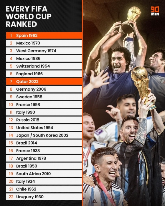 영국 매체 ‘90min’은 지난 22일(현지시간) 역대 월드컵 대회 랭킹을 발표했다. 1위는 1982 스페인 월드컵이며, 리오넬 메시의 우승으로 끝난 2022 카타르 월드컵은 7위에 위치했다.