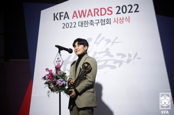 지난해 첼시 위민 소속으로 올해의 선수상을 받은 지소연은 올해는 수원FC 소속으로 올해의 선수상의 영예를 안았다.