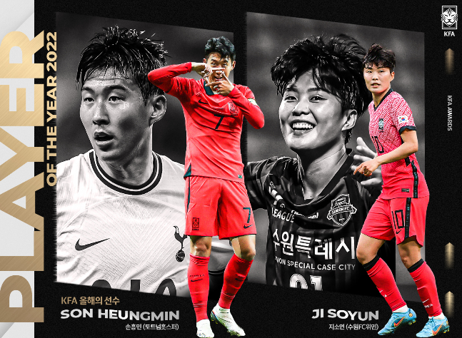 손흥민과 지소연은 23일 서울 웨스틴조선호텔에서 열린 2022 KFA 어워드(대한축구협회 시상식)에서 나란히 남·여 올해의 선수상의 영예를 안았다.