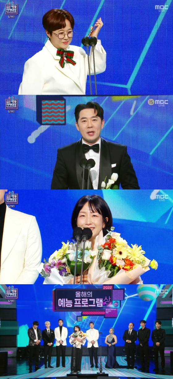 올해의 예능프로그램상은 '나 혼자 산다'에게 돌아갔다. 영광스러운 트로피를 받아든 '나 혼자 산다'의 PD는 "올 초에 전현무 씨가 한라산 등반에 성공했는데 '나 혼자 산다' 식구들끼리 우리에게 좋은 일이 있을 거라는 얘기를 나눴다. 그 기운이 통했는지 많은 시청자들이 '나 혼자 산다' 다시 사랑해 주시고 응원해 주시는 마음이 느껴지는 한 해였다. 그 마음 느끼면서 무지개 회원들도 열심히 살았다. 시청자들께 감사드리고, 무지개 회원들 한 명 한 명 아끼고 사랑한다고 말씀드리고 싶다"고 말했다.