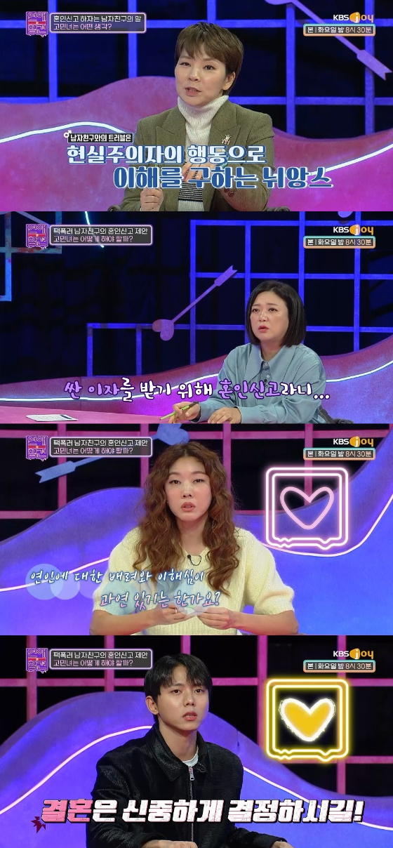신혼부부 대출 이자가 저렴하기 때문에 당장 혼인신고를 해야 한다는 것이다. 고민녀는 남자친구가 자신과 결혼하고 싶은 건지 집을 사고 싶은 건지 혼란스러워졌고, 남자친구는 당장 결혼할 건 아니라고 설명해 모두를 황당하게 만들었다.
