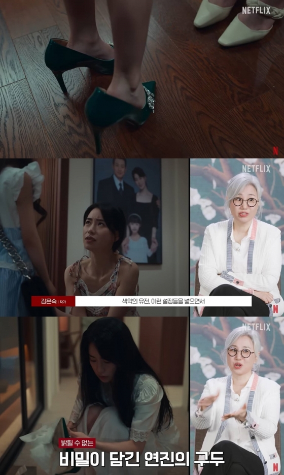 이에 김은숙 작가는 "색약의 유전, 이런 설정들을 넣으면서 구두를 초록으로 했다"며 "빨강은 너무 흔하지 않나"라고 말했다. 김은숙 작가는 또한 "초록 구두에 대한 의미를 굉장히 여러 분들이 물어보더라"며 "작가에게 다 의미가 있지 않다"고 전했다. 임지연이 "나도 물어보려 했다"고 하자, 김은숙 작가는 "연진이 발등 퍼스널 컬러에 맞는 초록"이라며 "어떤 비밀을 간직한 구두다. 연진이가 뒤에 가서 (구두를) 박박 닦기도 한다. 저런 구두가 어울리기 쉽지 않은데 '연진이는 어울리겠다' 해서 만든 구두다"고 설명했다.
