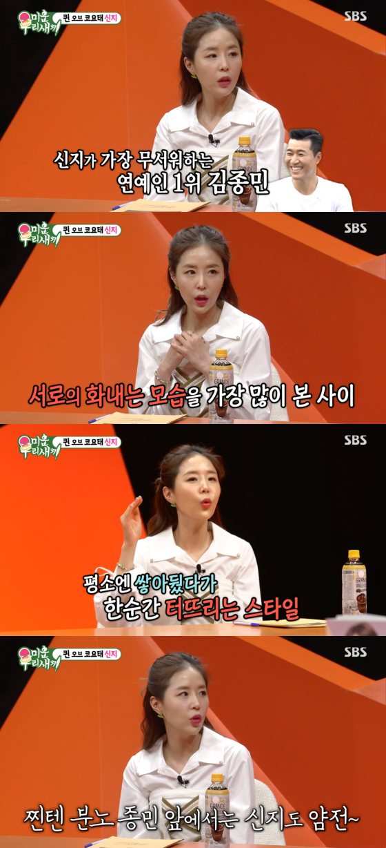 '미우새' 그룹 코요태의 신지가 김종민이 가장 무섭다고 말했다.