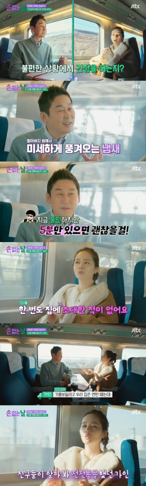 이어 한가인은 신동엽에게 "집에 친구 초대해 본 적 있냐"라고 물었다. 이에 신동엽은 "초등학교 저학년 때인데 할아버지가 치매가 있으셔서 집에 약간 미세하게 냄새가 났었다"라고 답했다. 이어 한가인은 "집 어딘지 모르지만 계속 할아버지가 계시니까 냄새가 났다. 난 익숙했지만 친구는 불편해 했다. 친구한테 '지금은 불편하지만 한 5분만 있으면 괜찮아질 거다' 말했다. 그랬더니 친구도 금방 적응해서 신기하다 했었다"라고 어린 시절을 회상했다.