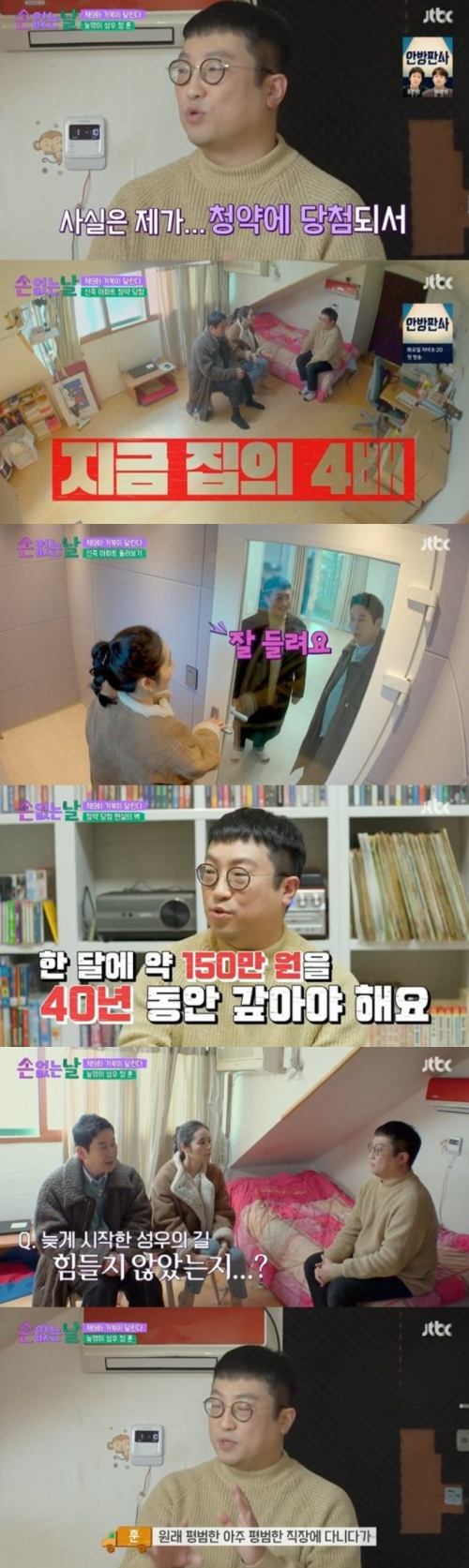 이어 최근 아파트 청약에 당첨된 사실을 밝힌 의뢰인은 "계속 대출 이자를 갚아야 한다"라며 "처음 당첨될 때만 해도 마냥 좋았는데 최근에는 금리가 장난 아니게 올랐다. 월 150만 원 정도를 40년동안 갚아야 한디"라고 밝혔다. 이에 신동엽이 "그걸 갚아 나가기에는 괜찮겠냐"라고 물었고, 의뢰인은 "지금도 조금 힘들긴 하다. 수입에 비해 힘들어서 주말에 시간 날 때마다 투잡으로 배달 아르바이트를 하고 있다"라고 털어놨다.