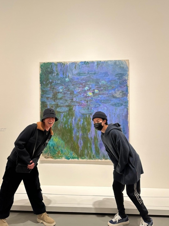 제이홉 역시 지난 21일 "겸댕이랑 놀기"라며 지민과 함께한 순간을 공개한 바 있다. 두 사람은 모네의 '수련'을 재해석한 그림 앞에서 인증샷을 찍으며 귀여운 케미를 발산했다.