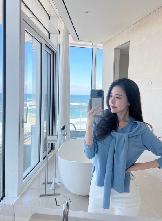 공개된 사진에서 아옳이는 바다가 보이는 오션뷰 숙소를 배경으로 직접 셀카를 찍고 있다.