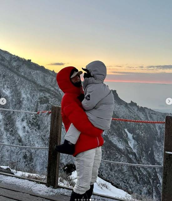 사진 속에는 이시영이 아들 정윤 군을 등에 업고 한라산을 등반한 모습이 담겨 있었다. 이시영은 한라산의 설산을 힘겹게 오르면서도 뿌듯해하는 미소를 짓고 있었다.