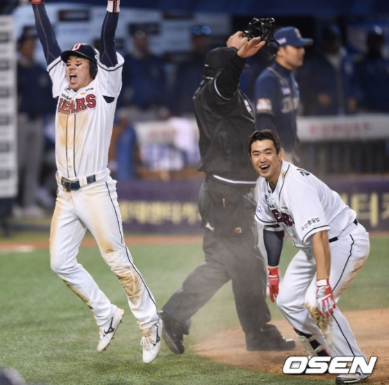 허경민(왼쪽)이 지난 2016년 10월 29일 잠실구장에서 열린 NC 다이노스와 한국시리즈 1차전에서 끝내기 득점을 올린 뒤 김재환과 함께 기뻐하고 있다.