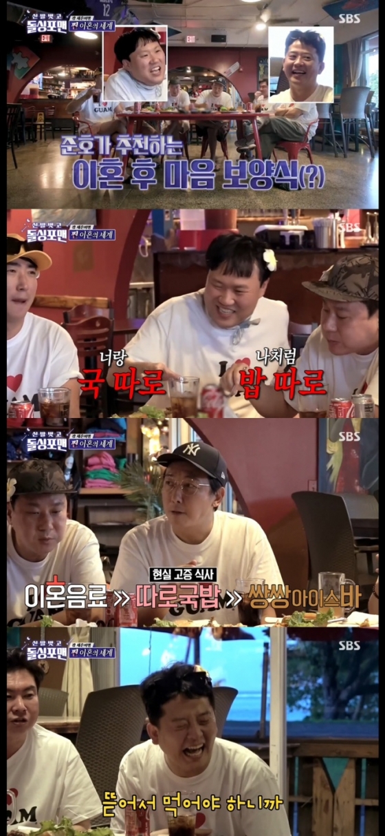 이날 돌싱포맨 멤버들과 김용명, 장동민은 괌 법원에서 이혼한 사람들이 가장 많이 방문하는 맛집에 방문해 식사를 하는 장면이 그려졌다. 식사를 기다리는 중 김용명은 김준호에게 "준호 형이 유일하게 현장 법원에 가서 이혼했잖아요. 법원에 다녀와서 음식 뭐 먹었냐"라고 물었다. 이에 김준호는 "나는 형들이랑 좀 다르다. 나는 이혼하러 갔는데 시간대를 너무 일찍 갔다. 그래서 전 부인과 30분 차에서 기다렸다. 적막이 흘렀다"라고 답했다.