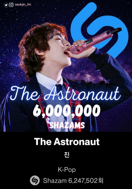 진의 첫 솔로 싱글 'The Astronaut'(디 애스트로넛)은 1월 19일 600만 샤잠을 돌파했다. 2022년 발매된 K팝 최초이자 최다 샤잠 된 곡 신기록을 자체 경신했다.