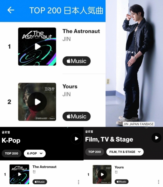 한국 차트에서는 'The Astronaut'뿐 아니라 'Yours', 'Moon', 'Epiphany', 'Awake'(어웨이크), 'Abyss'(어비스), '이 밤'까지 진의 솔로 7곡이 안착해 진의 막강한 브랜드 파워를 실감케 했다.