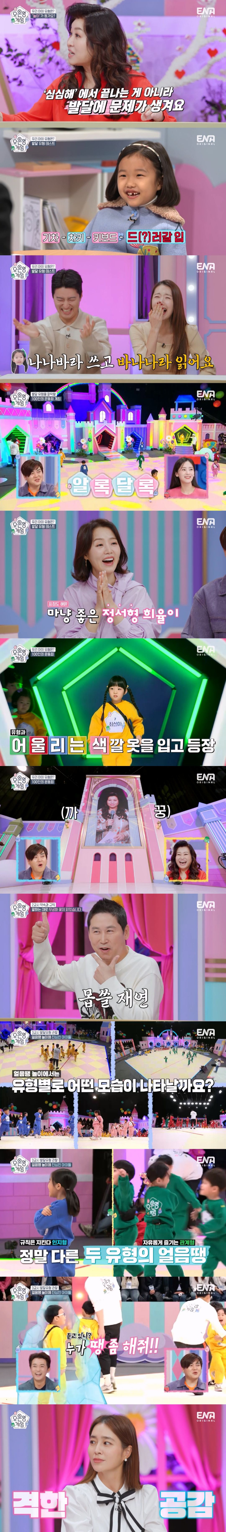 패널 자녀들의 발달유형 테스트가 공개됐다. 발달유형 테스트는 연령에 따라 각기 다른 간단한 테스트 총 50문항과 상담을 통해 진행했다. 안재욱의 딸 안수현은 '언어형', 인교진·소이현의 딸 인소은은 '신체형', 문희준·소율의 딸 문희율은 '정서형', 정준호·이하정의 딸 정유담은 '관계형'으로 전부 달랐다.