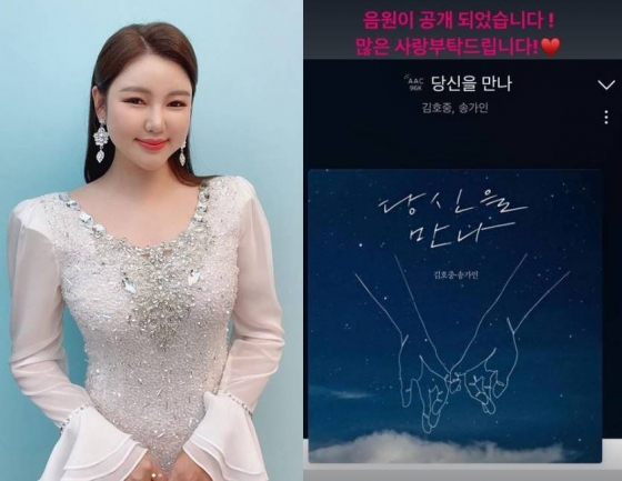 송가인은 25일 자신의 인스타그램에 "'복덩이들고'에서 발표하게 된 복덩이 남매 호중이와 첫 듀엣곡 '당신을 만나' 음원이 공개되었습니다 ! 많은 사랑부탁드립니다 !!!!!♥"라고 글을 올렸다.