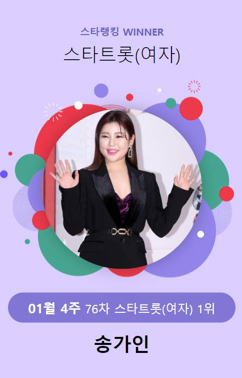 송가인은 1월 19일 오후 3시 1분부터 1월 26일 오후 3시까지 진행된 1월 4주 스타트롯 여자 랭킹 투표(76차)에서 1위를 차지했다.