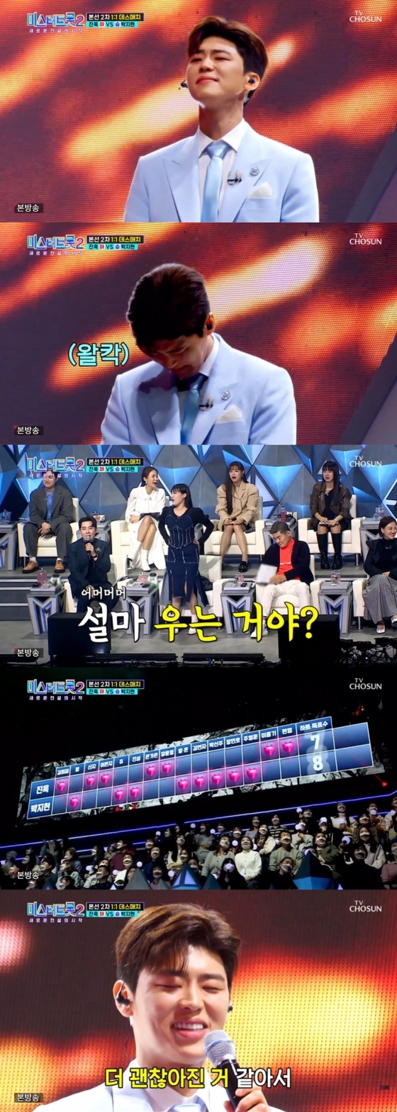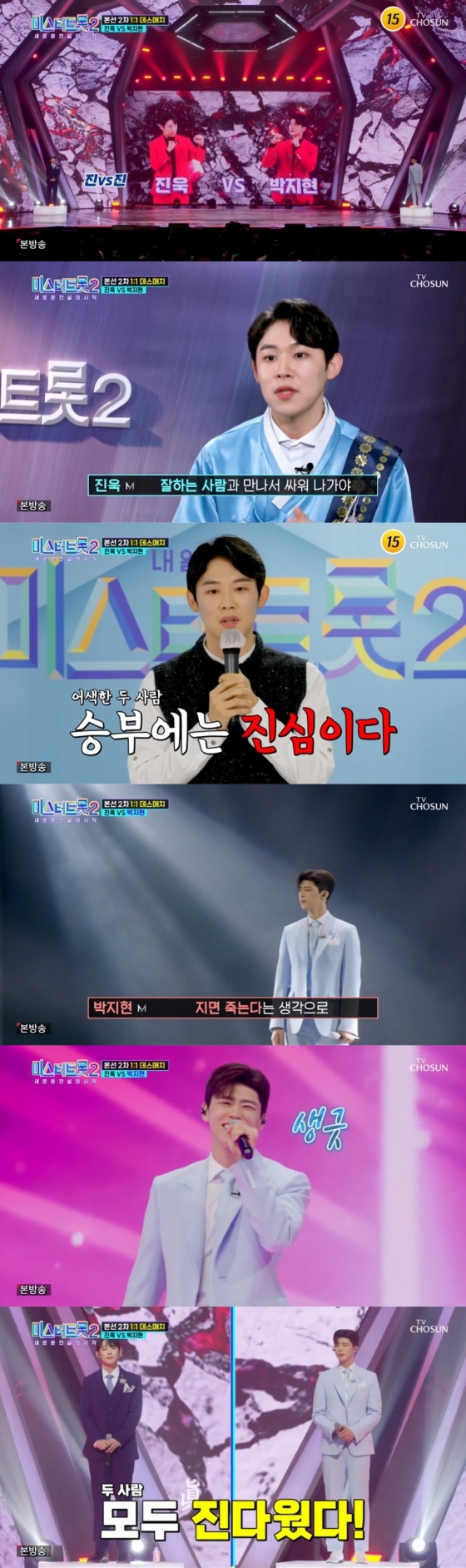 26일 오후 방송된 TV조선 경연 프로그램 '미스터트롯2-새로운 전설의 시작'에서는 예심에서 '진'을 차지했던 박지현과 팀 미션에서 '진'을 차지했던 진욱의 1대 1 데스매치 장면이 그려졌다.