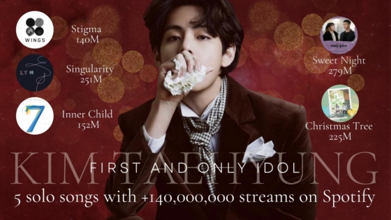방탄소년단(BTS) 뷔가 세계 최대 음원 플랫폼 스포티파이(Spotify)'에서 1억 4000만 스트리밍 솔로곡 5곡을 보유한 최초이자 유일한 한국 아티스트 타이틀을 획득, 인기를 빛냈다.