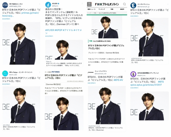 PR Times, 아시아 최대 음악 전문 웹 iFLYER, FNN, Music Man 등 일본 미디어는 뷔가 1위 선정 소식을 전하며 "1위를 차지한 뷔는 BTS에서도 압도적인 카리스마를 자랑하는 멤버다. 조각처럼 아름다운 비주얼은 해외 언론에서도 높은 평가를 받고 있다"고 뷔의 다양한 비주얼 관련 업적들을 소개했다.