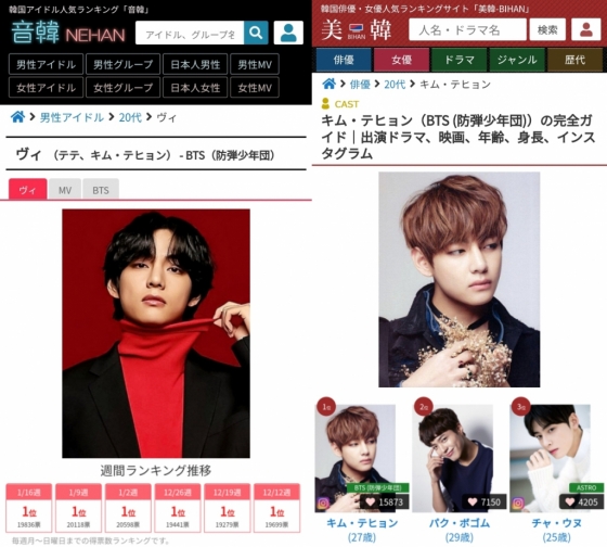 1월 16일부터 22일까지 아이돌 랭킹 사이트 '네한'에서 실시한 'K-팝 남자 아이돌 랭킹' 투표에서 뷔는 1만 9836표로 95주 연속 1위를 차지했으며, 한국 배우 인기 랭킹 사이트 '비한(美韓)'의 '20대 한국 배우' 랭킹에서도 1만 5873표를 받으며 91주 연속 1위를 기록, 독보적인 인기를 자랑했다.