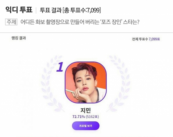 지민이 1월 15일부터 1월 21일까지 익사이팅 디시에서 진행한 '어디든 화보 촬영장으로 만들어 버리는 '포즈 장인' 스타는?' 설문에서 총 7099표 중 5162표를 획득, 72.71%의 득표율로 1위를 차지했다.