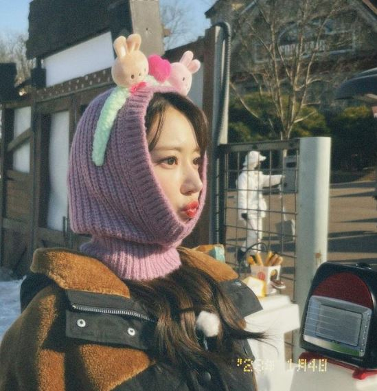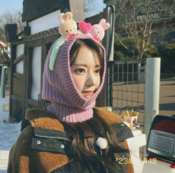 공개된 사진 속 사쿠라는 보라색 바라클라바를 쓰고 그 위에 토끼 머리띠를 쓴 채 새초롬한 표정을 취하고 있다. 또 다른 사진에서는 볼에 바람을 넣은 채 귀여운 매력을 뽐내고 있다. 그의 작은 얼굴과 뚜렷한 이목구비가 보는 이들의 시선을 사로 잡는다.