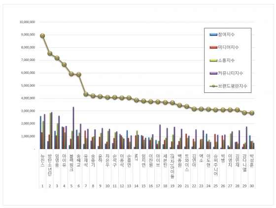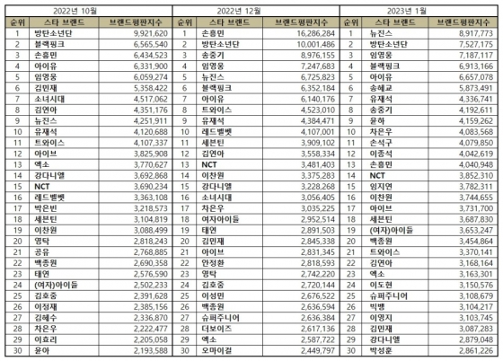 2023년 1월 스타 브랜드평판 30위 순위는 뉴진스, 방탄소년단, 임영웅, 아이유, 블랙핑크, 송혜교, 유재석, 송중기, 윤하, 차은우, 손석구, 이종석, 손흥민, NCT, 임지연, 이찬원, 아이브, 세븐틴, (여자)아이들, 백종원, 트와이스, 김연아, 엑소, 이도현, 슈퍼주니어, 빅뱅, 이영지, 김민재, 강다니엘, 박성훈 순으로 분석됐다.
