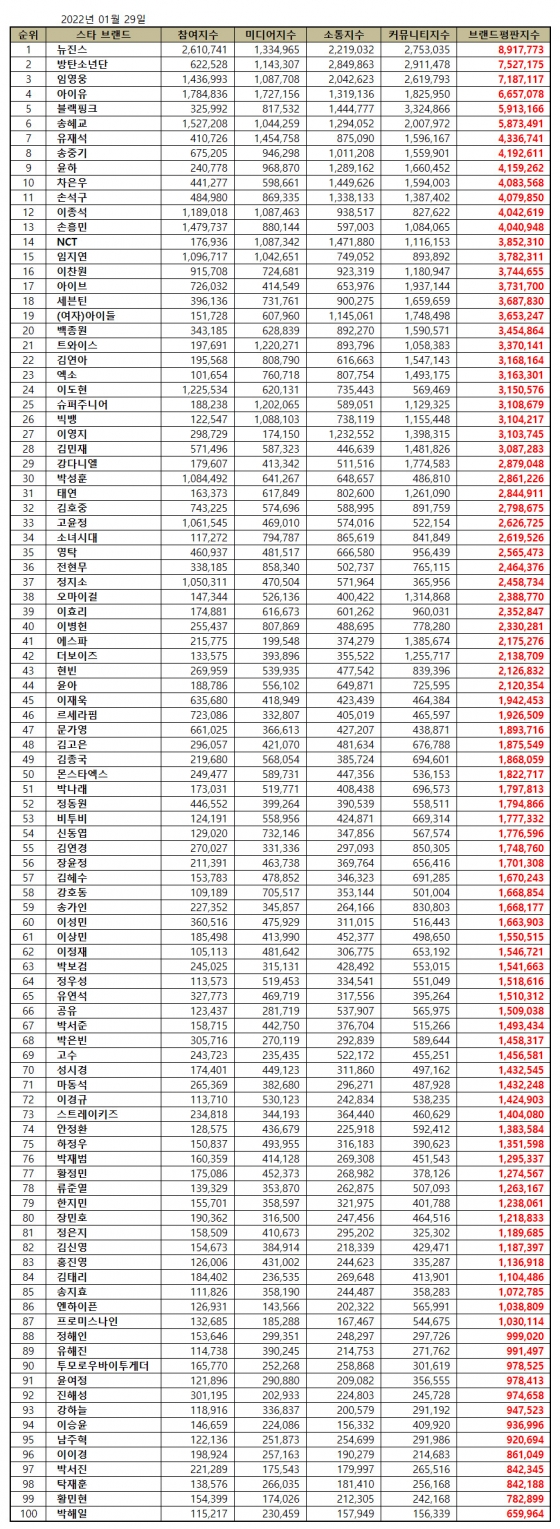 스타 브랜드평판 2023년 1월 빅데이터 분석 100위는 뉴진스, 방탄소년단, 임영웅, 아이유, 블랙핑크, 송혜교, 유재석, 송중기, 윤하, 차은우, 손석구, 이종석, 손흥민, NCT, 임지연, 이찬원, 아이브, 세븐틴, (여자)아이들, 백종원, 트와이스, 김연아, 엑소, 이도현, 슈퍼주니어, 빅뱅, 이영지, 김민재, 강다니엘, 박성훈, 태연, 김호중, 고윤정, 소녀시대, 영탁, 전현무, 정지소, 오마이걸, 이효리, 이병헌, 에스파, 더보이즈, 현빈, 윤아, 이재욱, 르세라핌, 문가영, 김고은, 김종국, 몬스타엑스, 박나래, 정동원, 비투비, 신동엽, 김연경, 장윤정, 김혜수, 강호동, 송가인, 이성민, 이상민, 이정재, 박보검, 정우성, 유연석, 공유, 박서준, 박은빈, 고수, 성시경, 마동석, 이경규, 스트레이키즈, 안정환, 하정우, 박재범, 황정민, 류준열, 한지민, 장민호, 정은지, 김신영, 홍진영, 김태리, 송지효, 엔하이픈, 프로미스나인, 정해인, 유해진, 투모로우바이투게더, 윤여정, 진해성, 강하늘, 이승윤, 남주혁, 이이경, 박서진, 탁재훈, 황민현, 박해일 순으로 분석됐다.