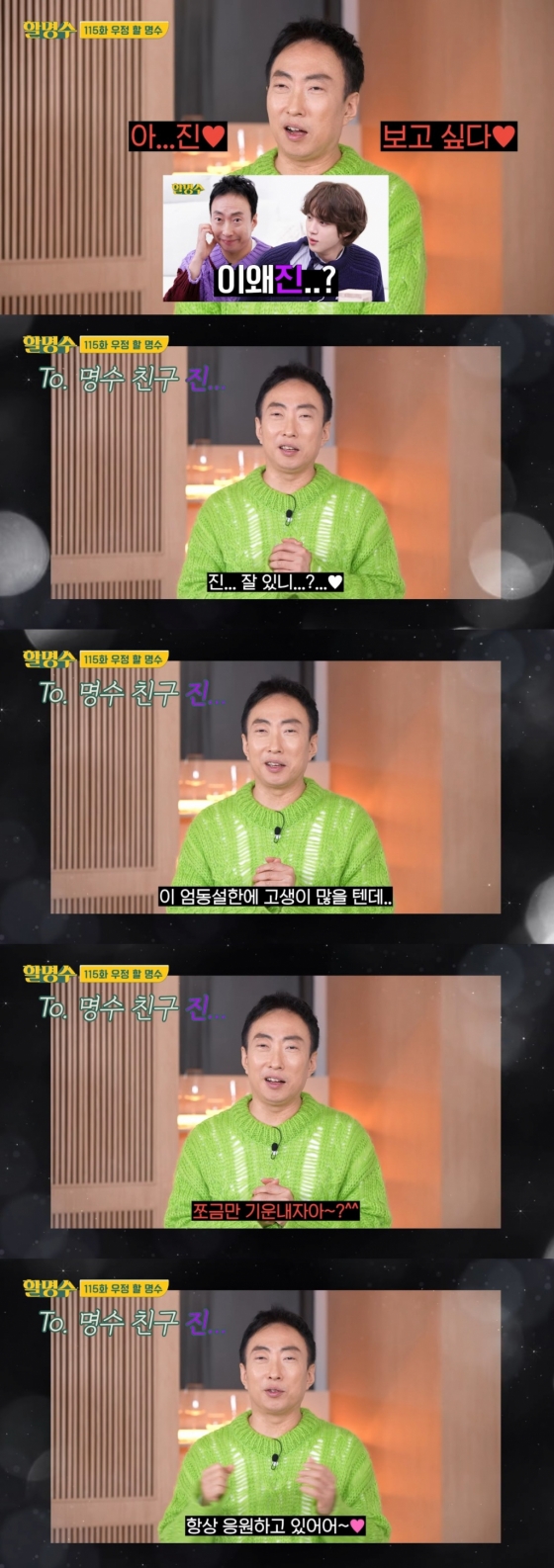 지난해 12월 13일 육군 현역으로 입대한 진을 그리워하며 박명수가 진심 어린 응원을 보낸 것.